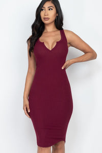 Sleeveless Split V Neckline Rib Knit Bodycon Midi Dress
